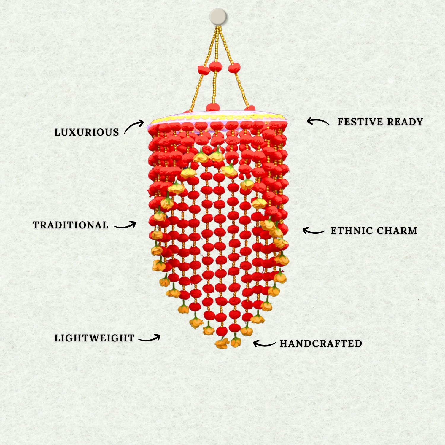 Be the first to review “Red Pompom Diwali Jhumar with Yellow Flower for Home Decor”